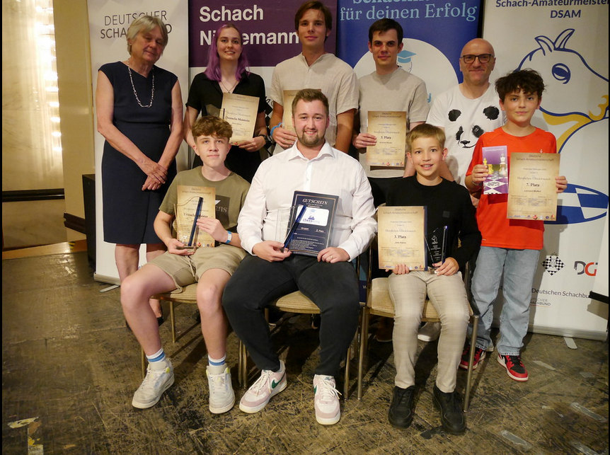 Bad Wildungen, 20. Juli 2025: Mit achtbaren Resultaten, aber nicht mit Spitzenplätzen kehrte das Trio aus dem märkischen Südkreis am Wochenende vom Bundesfinale der Deutschen Schach-Amateurmeisterschaft (DSAM) aus Bad Wildungen zurück. Das für den SV Erkenschwick aktive U18-Talent Max Lutze aus Halver belegte in der A-Klasse, in der sich die 42 stärksten Spieler des Wochenendes trafen, mit 2,0 Punkten den 31. Platz. In den ersten vier Runden kam Lutze gegen starke Akteure aus Leipzig (2), München und Braunschweig zu vier Remispartien. In der letzten Runde musste er sich Holger Namyslo aus Biberach geschlagen geben und fiel damit noch etwas zurück. Die A-Klasse gewann der Magdeburger Benjamin Wagner.